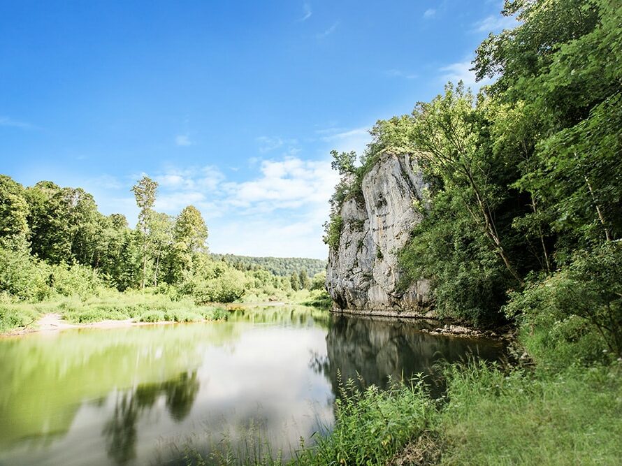 Der Fürstliche Park Inzigkofen ist ein wildromantisches Kleinod, welcher sich durch knorrige Bäume, schroffe Felswände und die mitten hindurchfließende Donau auszeichnet. Er ist somit auch die ideale Fotoshooting- Location für natürliche Hochzeitsfotos.