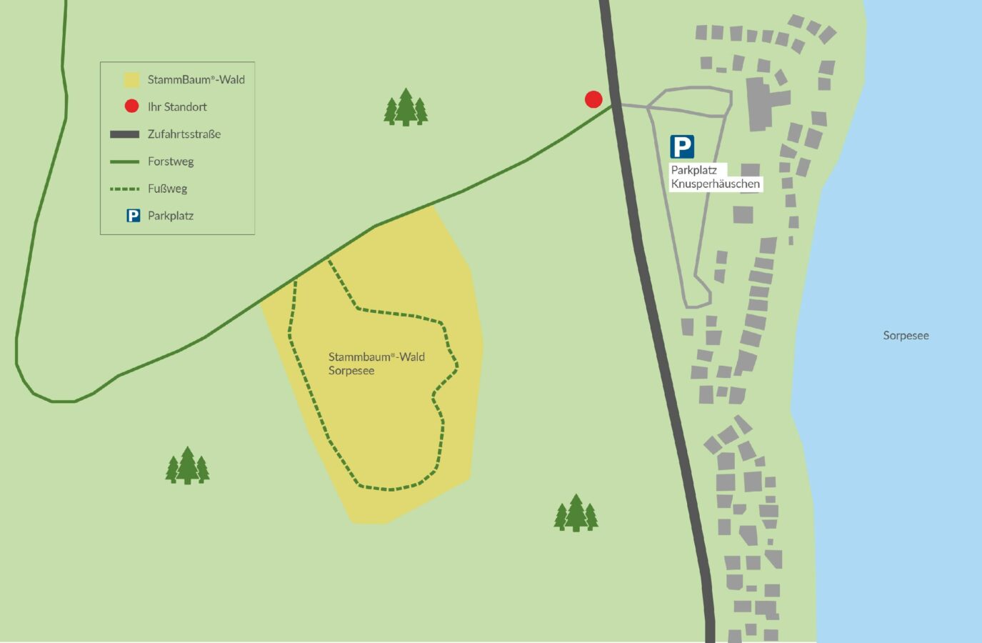 Am Ufer des Sorpesees gelegen befindet sich der erste StammBaum® Wald in Nordrhein-Westfalen. Von den öffentlichen Parkplätzen am Restaurant Meilenweit sowie Knusperhäuschen gelangen Sie unmittelbar in den StammBaum® Wald am Ufer des Sorpesees. Der Wald zieht sich die Böschung entlang eines Wanderweges hinauf und eröffnet ein traumhaftes Panorama über den Sorpesee bis zur Staumauer in 3 Kilometern Entfernung. Der Laubwald bezaubert seine Besucher durch die Lage am geschwungenen Hang des Sorpesees sowie durch den phänomenalen Ausblick auf das Wasser. Und selbst in den Ecken ohne Sichtachse schimmert immer das tiefe Blau des Sees durch das Laub der Blätter.